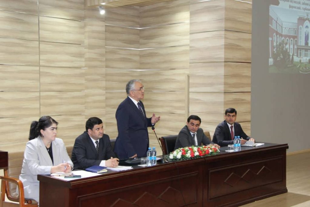 Дар толор ҷамъ омадани устодони кафедраҳои умумидонишгоҳии фалсафа, педагогика, тарбияи ҷисмонӣ, назарияи иқтисодӣ, забонҳои хориҷӣ ва умуман, ҳамаи инҷо нишастаҳо давоми суҳбатҳои мову шумо бо ҳайати устодону кормандони донишгоҳ аст. Ҳузури шумо ҳисси масъулият аст ва раёсати васеи имрӯза фарогири ду мавзуъ мебошад: Татбиқи стратегиву барномаву нақшаҳои зиёди давлатӣ ва баъдан низоми илму таълиму тарбия.
